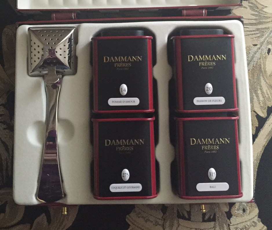 My goody bag contained a lovely checkered tea chest with four different loose-leaf teas and a spoon strainer.